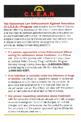 - The Potter County Drug and Alcohol Program will not deny a client services based on age, sex, physical and/or mental conditions, geographic area (within Potter County), sexual preference, handicap, legal status or prior involvement with this agency.